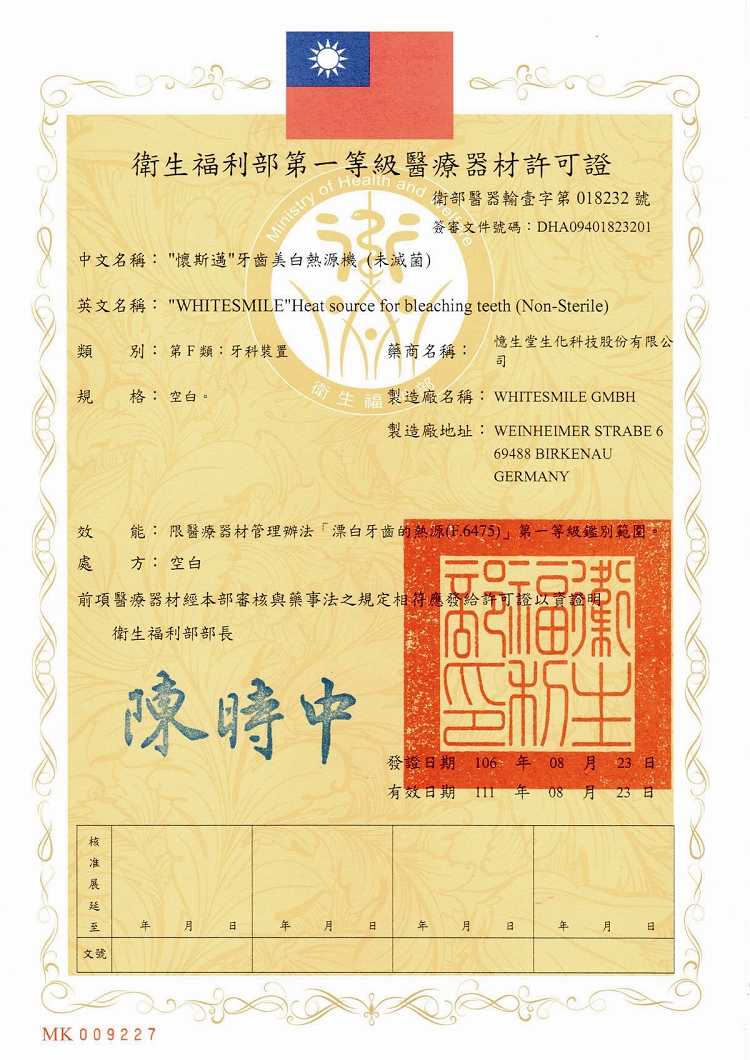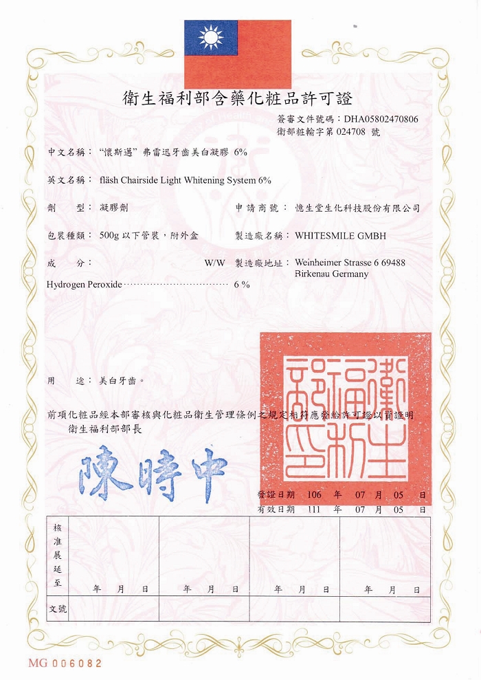 德國原裝進口whitesmile經臺灣衛生署認證合格之美白藥劑