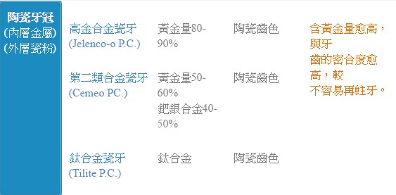 在內層金屬外燒上瓷粉,讓它呈現出牙齒相同的顏色,不想滿嘴金牙的人就建議選擇陶瓷牙冠,內層金屬的黃金含量愈高。