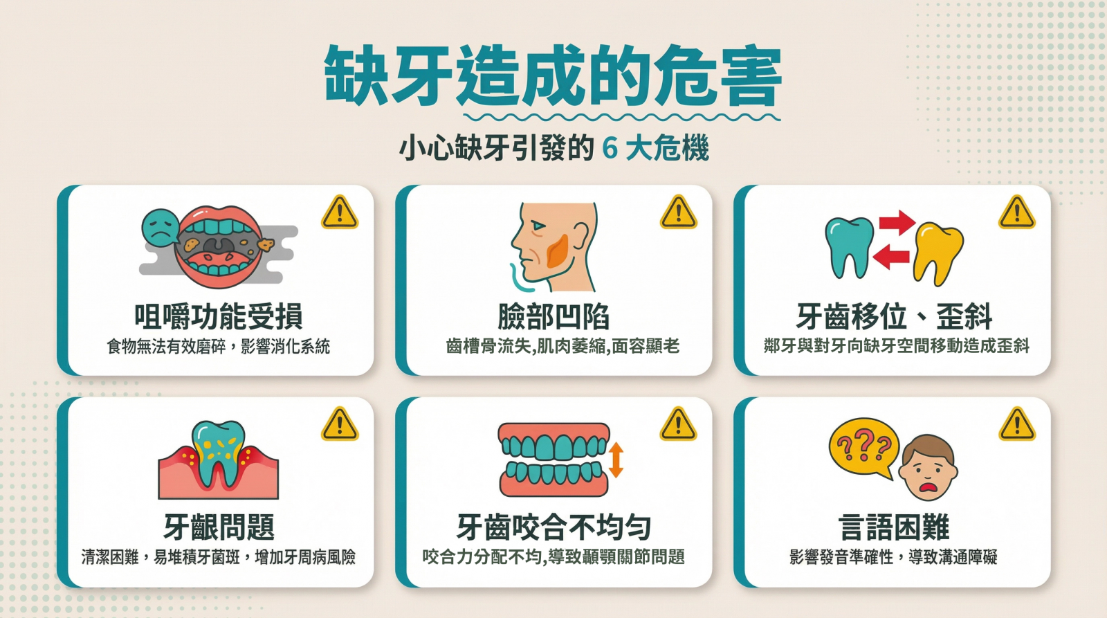 ▲ 缺牙造成的 6 大危害(Hidens 誠楷牙醫診所提供)